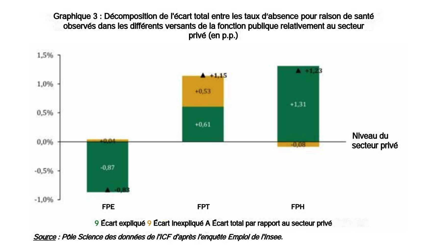 Dit autrement, «cela signifie qu’à structures d’emplois identiques, pour les caractéristiques susmentionnées, la FPE, la FPH et le secteur privé seraient au même niveau d’absentéisme et l’écart entre la FPTet le privé ne serait que la moitié de celui observé», notent les rapporteurs.
