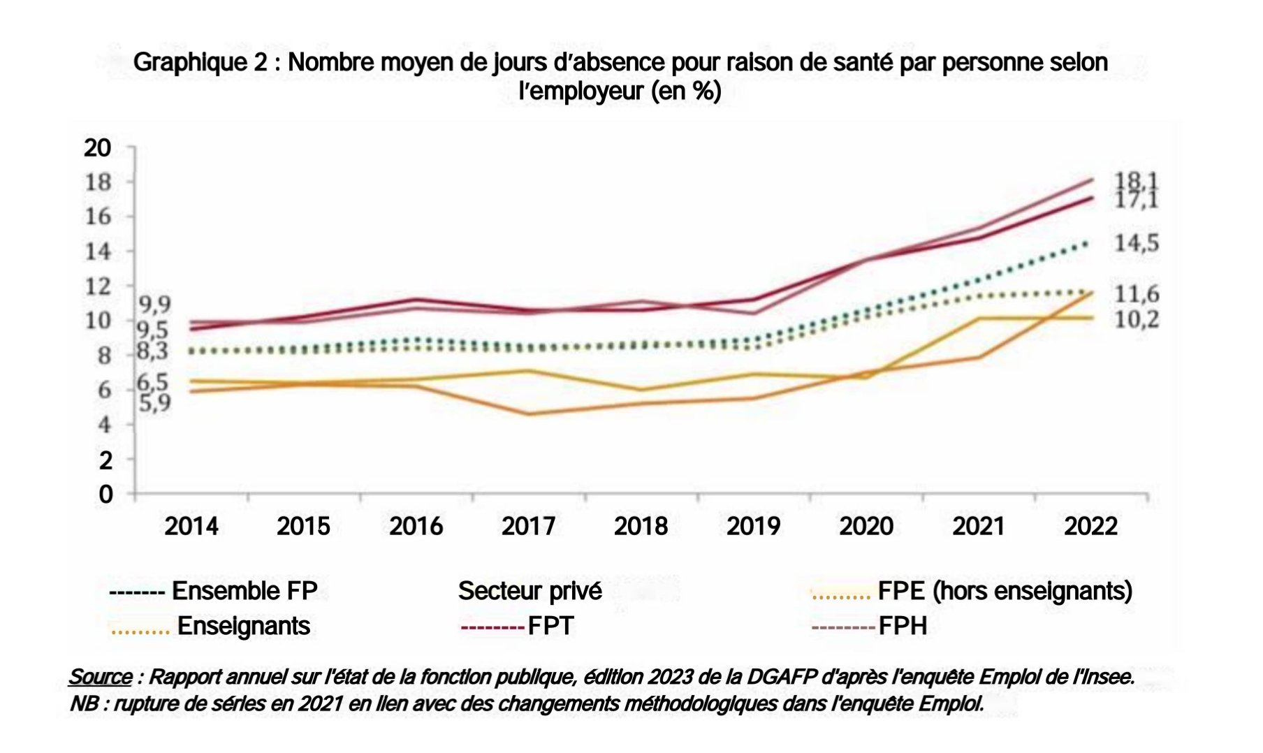 En 2022, les personnels de la fonction publique hospitalière (FPH) présentaient ainsi un nombre moyen de 18,1 jours et ceux de la territoriale (FPT), de 17,1 jours.