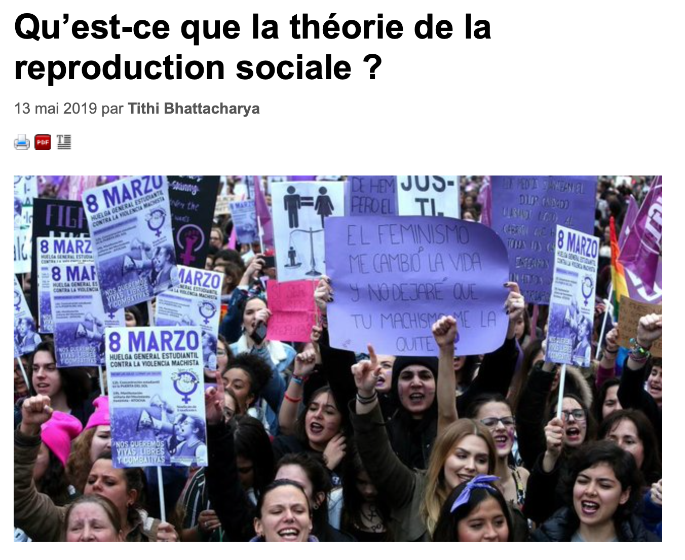 Ces contributions à la théorie critique et pour un féminisme marxiste trouvent un écho puissant dans les formidables mobilisations féministes qui traversent actuellement la planète (dont Tithi Bhattacharya est une organisatrice aux États-Unis), défiant le capitalisme et ses structures patriarcales, coloniales et racistes. En témoigne la traduction en une vingtaine de langues à ce jour de Féminisme pour les 99 %. Un Manifeste, de Cinzia Arruzza, Tithi Bhattacharya et Nancy Fraser, publié en français aux éditions La Découverte (2019), dont on pourra lire un extrait sur le site Contretemps.
