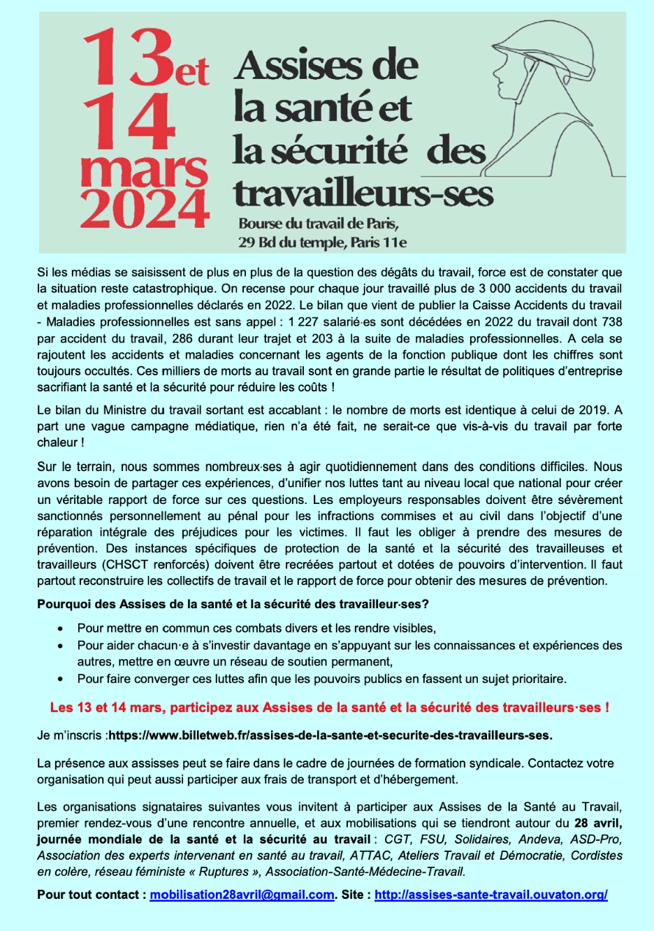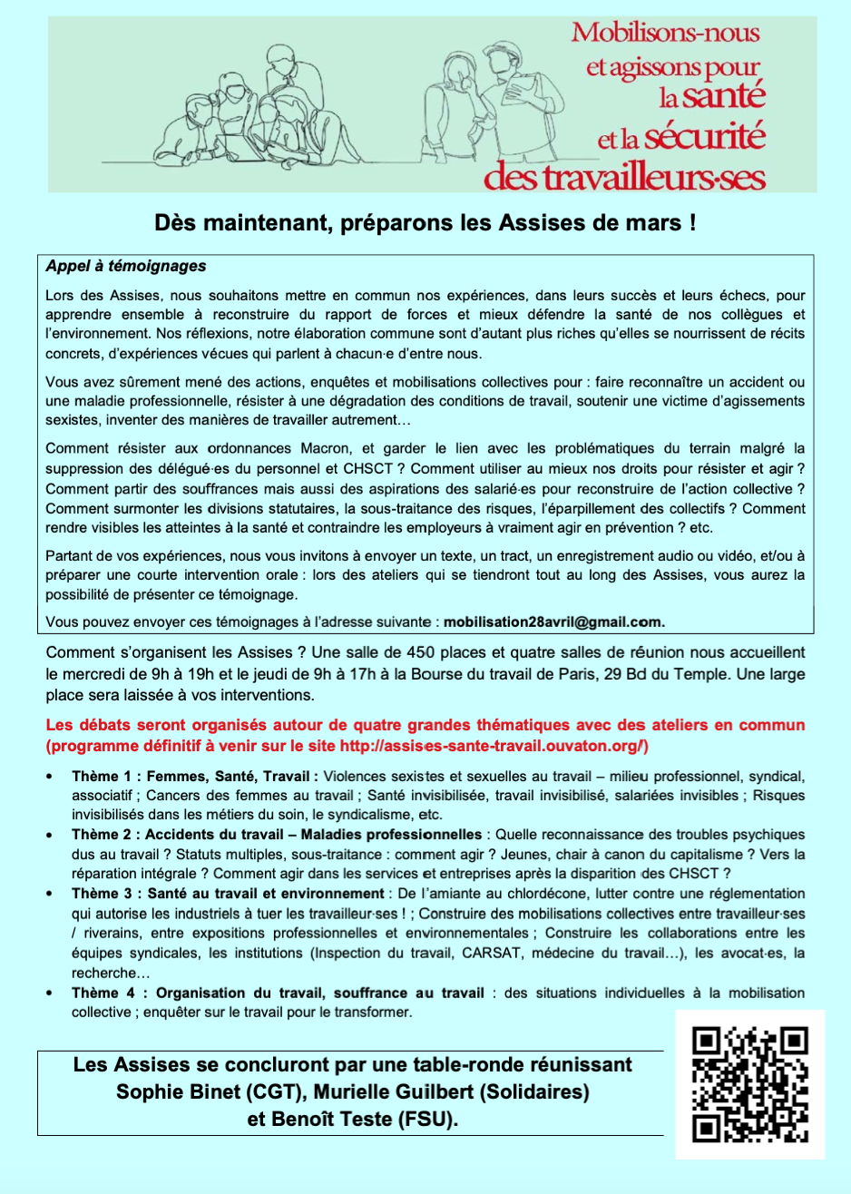 Assises de la santé et de la sécurité des travailleurs·euses pauldevin592024-02-12T11:19:50+01:00 12 février 2024|Catégories : Travail et syndicalisme| VOIR EN LIGNES’INSCRIRE Articles similaires Rapport CHSCT 2023 (chantier Travail et syndicalisme) Rapport CHSCT 2023 (chantier Travail et syndicalisme) RPS : Un enjeu de santé au travail pour les militants eux-mêmes ? RPS : Un enjeu de santé au travail pour les militants eux-mêmes ? Ne pas lâcher le travail … ou comment l’attraper ? Ne pas lâcher le travail … ou comment l’attraper ? Cécile Briec : agir sur les risques psychosociaux, une approche par l’analyse du travail Cécile Briec : agir sur les risques psychosociaux, une approche par l’analyse du travail