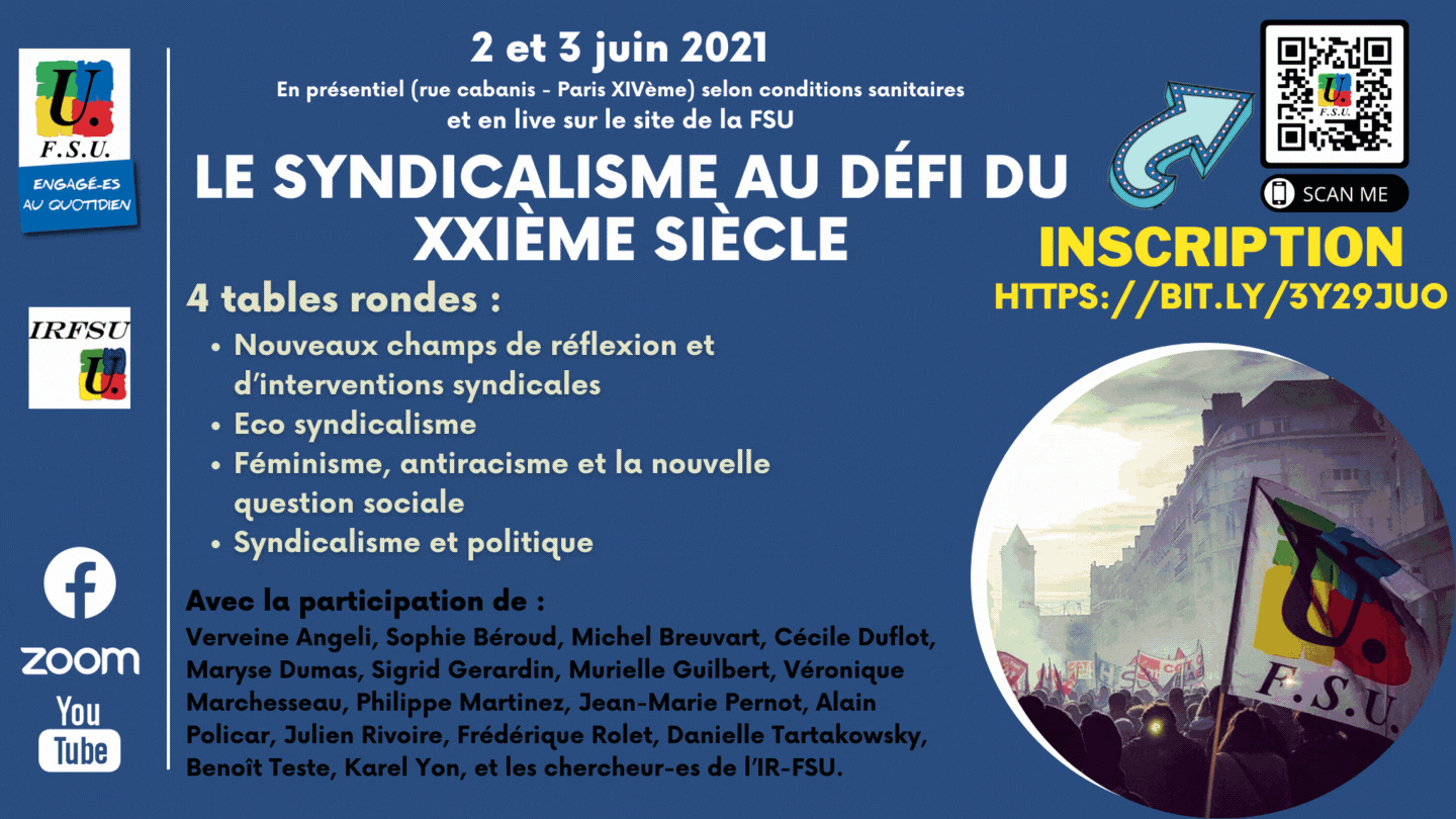 Chaque table ronde comprendra un-e animateur-trice des débats et, à égalité de temps, 4 intervenant-es (chercheur-es de l’IRFSU , chercheur-es académiques, responsables associatif-ves, syndicalistes de la FSU et d’autres organisations) et sera suivie d’un débat avec la salle.