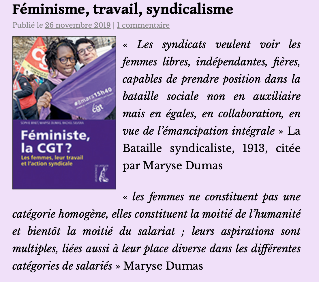 Féminisme, travail, syndicalisme DP2022-04-16T18:41:05+02:00 26 novembre 2019|Catégories : Femmes-Savoirs-Pouvoirs| Entre les lignes entre les mots Une note de lecture de Didier Epsztajn du livre de Sophie Binet, Maryse Dumas, Rachel Silvera : Féministe, la CGT ?Les femmes, leur travail et l’action syndicaleLes éditions de l’atelier, Ivry-sur-Seine 2019, 192 pages, 17 euros Lire en ligne … Articles similaires Bibliographie Femmes-Savoirs-Pouvoirs Bibliographie Femmes-Savoirs-Pouvoirs L’oppression est globale, la résistance doit être globale ! L’oppression est globale, la résistance doit être globale ! Égalité entre les femmes et les hommes dans la FSU Égalité entre les femmes et les hommes dans la FSU Qu’est ce qu’un syndicat féministe ? Qu’est ce qu’un syndicat féministe ?